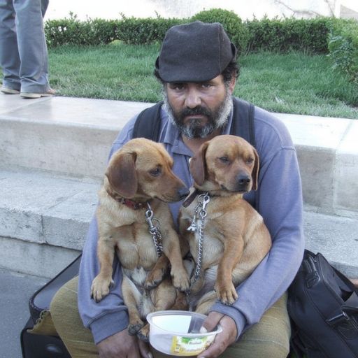 Sitting on a blanket, coat frayed, hair wild, holding two puppies against his chest like they were the only thing keeping him upright.