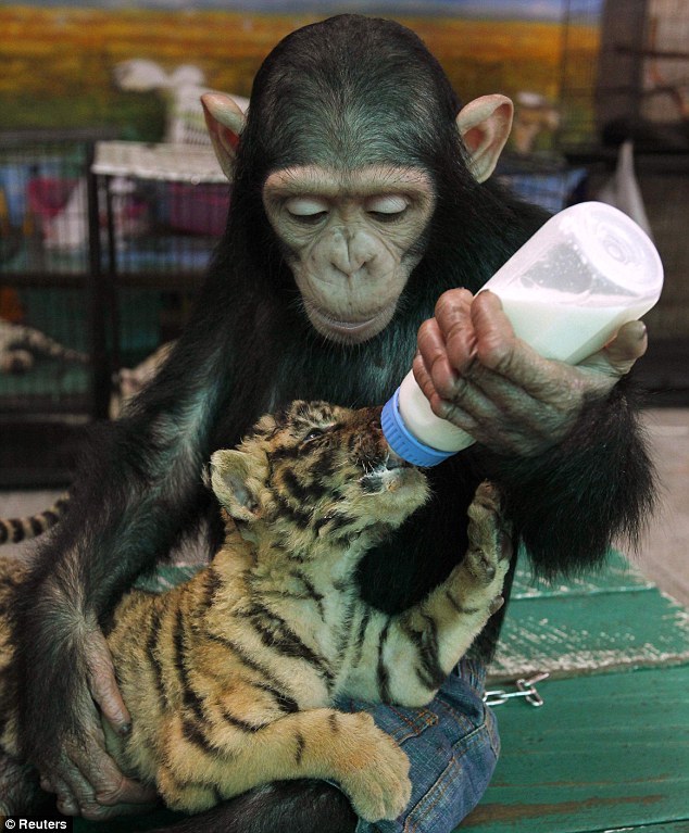 These adorable images reveal the close bond that has formed between a two-year-old chimpanzee called Do Do and a two-month-old tiger cub called Aorn.