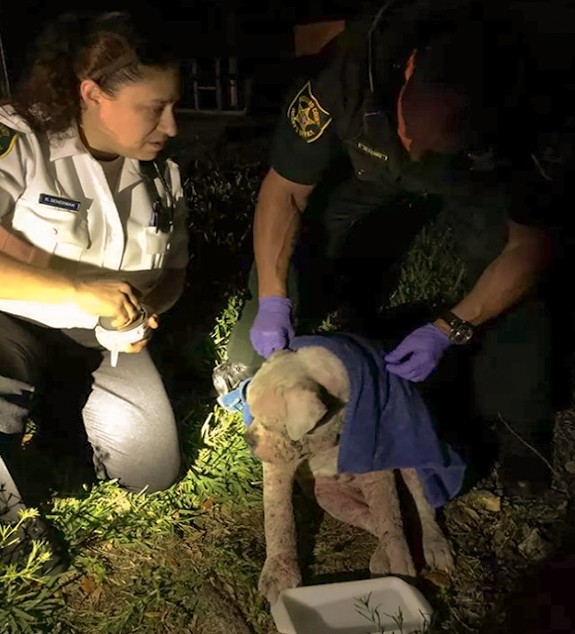 At last, deputies from the Broward Sheriff’s Office arrived. What they found broke their hearts. Powder was so weak he couldn’t even lift himself to stand, his spirit nearly gone. Gently, they offered him food and water, and for the first time in a long while, a flicker of hope appeared. Slowly, the starving pup responded to their kindness, his weary eyes beginning to show a faint spark of life again. In that moment, Powder wasn’t just being rescued from the swamp—he was being given a second chance at life.