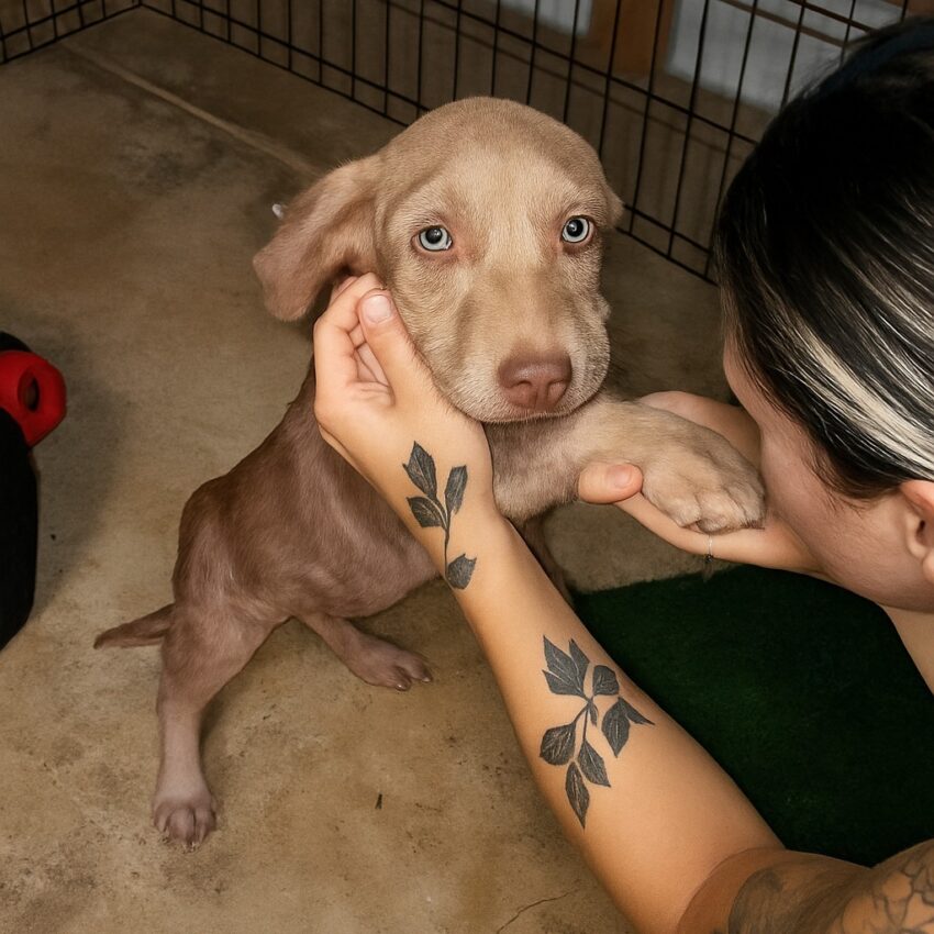 When Aria reached out gently, Squishy leaned in instead of pulling away. The puppy accepted her first careful pets and, before long, gave shy little kisses.