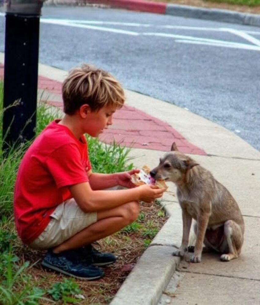 For months, I thought my son’s missing sandwiches and empty lunchbox were just the growing pains of a kid stretching into his next season. But that spring afternoon when I followed Theo behind the old hardware store, I found him sitting cross-legged on concrete, sharing his lunch with the skinniest, saddest stray I’d ever seen. The dog poked his head from beneath a rusted dumpster, ribs sharp as knuckles under his fur, but his tail wagged wildly the moment Theo whispered, “Hey, buddy.” I watched from a distance, my throat tight, as my gentle, old-souled boy gave that dog half his sandwich and then poured water into folded wax paper like it was a crystal bowl. He called the dog Rusty. He didn’t know I was there. He didn’t know he was teaching me how much kindness a child could carry.