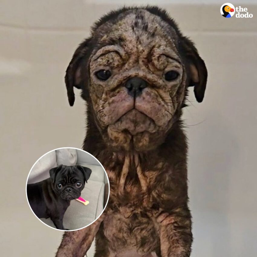 A few months ago, staff took in a tiny puppy, who instantly broke their hearts. They’d rescued many sick and injured pets in the past, but this 8-pound pug shocked them all when she arrived with no fur and inflamed, red skin.