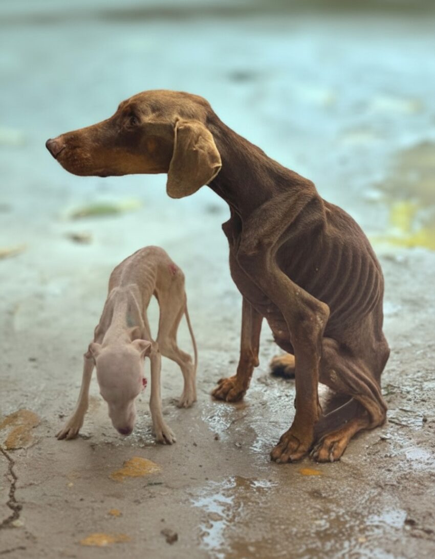 The villagers who found them—Ravi, his wife Lakshmi, and a few neighbors returning from a nearby temple—had initially been drawn by a faint, persistent whining that cut through the festive drumming in the distance. “It sounded like a human baby crying,” Lakshmi later recounted in a trembling voice to local reporters. As they approached the shed, hidden behind overgrown thickets of neem trees, the stench hit them first—a nauseating mix of decay and ammonia that forced several to retch. Peering through a gap in the rusted metal sheets, they saw the dogs: the mother, a female Vizsla mix with soulful amber eyes, sat hunched over, her head lowered protectively toward her pup. The little one, a pale cream-colored bundle with a disproportionately large head, was nosing at her mother’s flank, desperately seeking milk from udders that hung empty and shriveled. Both dogs were alive, but only just; their eyes were sunken, coated in a milky film, and every breath seemed labored. In a twist no one anticipated, the mother dog, despite her starvation, refused to let anyone near her pup at first. She bared her teeth weakly, a mother’s fierce instinct overriding her exhaustion, until Ravi tossed a piece of roti from his pocket into the enclosure. Only then did she nudge it toward the pup, revealing the depth of her maternal devotion.