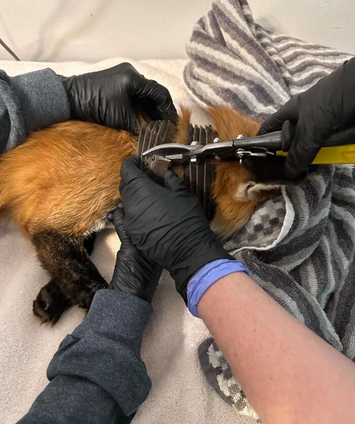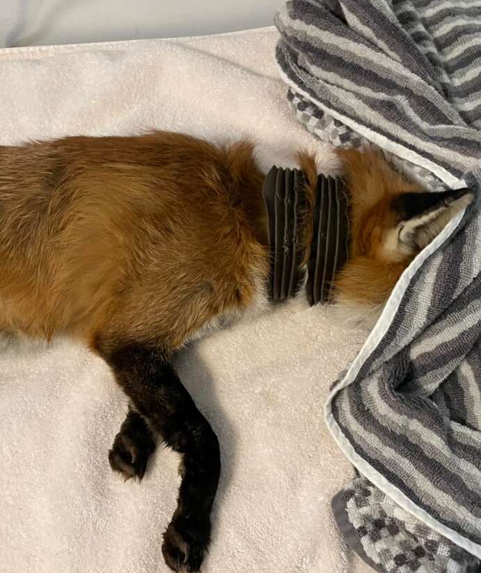 “The object around his neck was likely a section of drainage pipe,” Amanda Leyden, a licensed wildlife rehabilitator and clinic director at Aark, told The Dodo. “Small animals sometimes take shelter in these pipes, and a curious fox may stick its head inside to investigate or hunt, only to find itself stuck when trying to back out.”