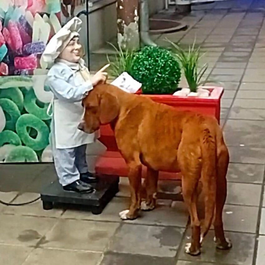 There, on the sidewalk in front of a bakery, was a lonely stray dog. Clearly starved for love, the poor pup had found a bittersweet alternative to a caring human touch, something he’d been living without.