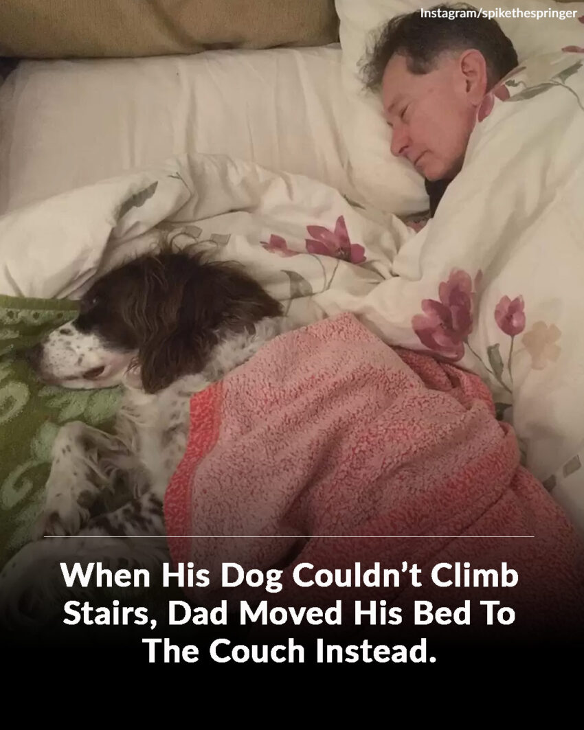 When a beloved pet begins to slow down with age, families often face difficult changes. In the case of Spike, a 14-year-old English springer spaniel, those changes have inspired a touching display of devotion from the people who love him most. After suffering two strokes and losing the strength to climb stairs, Spike’s family came up with a simple yet profound solution: they brought the bedroom to him. This story of a dad sleeping on the sofa with his senior dog is a heartwarming example of the bond between humans and their pets, and the lengths we go to for those we love.
