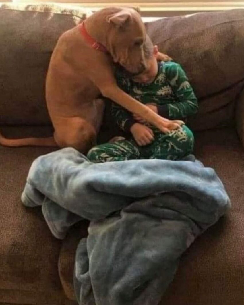 At first, he wasn’t sure. The smells were new, the house unfamiliar. But the boy in his dinosaur pajamas sat quietly, blanket draped over his lap, giving him space. Slowly, the dog climbed up beside him. One paw reached out, hesitant but hopeful. And then, as if the weight of all those lonely nights suddenly broke free, he pressed his head down gently on the boy’s shoulder and wrapped his arms around him.