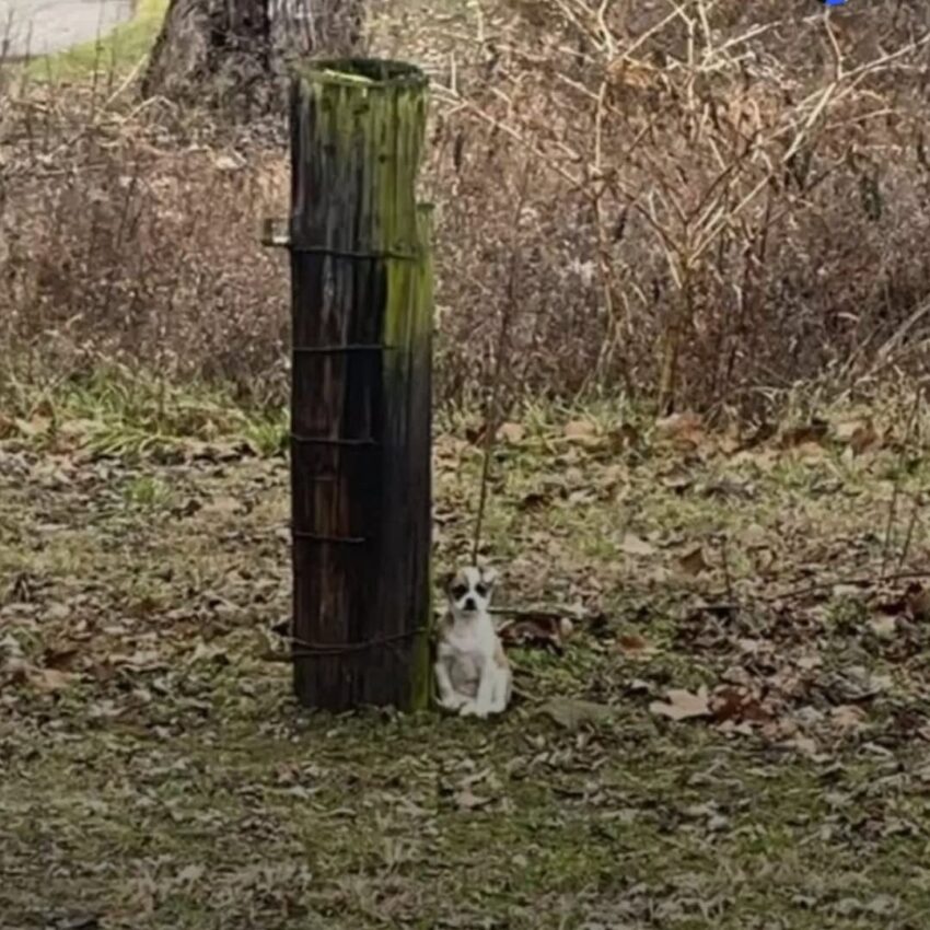 Speeding down a Kentucky roadway, a driver spotted something that made them slow down. A tiny brown and white puppy tied to a broken tree sat patiently waiting near the pavement. The driver contacted a local shelter, and a rescue team rushed to collect her.
