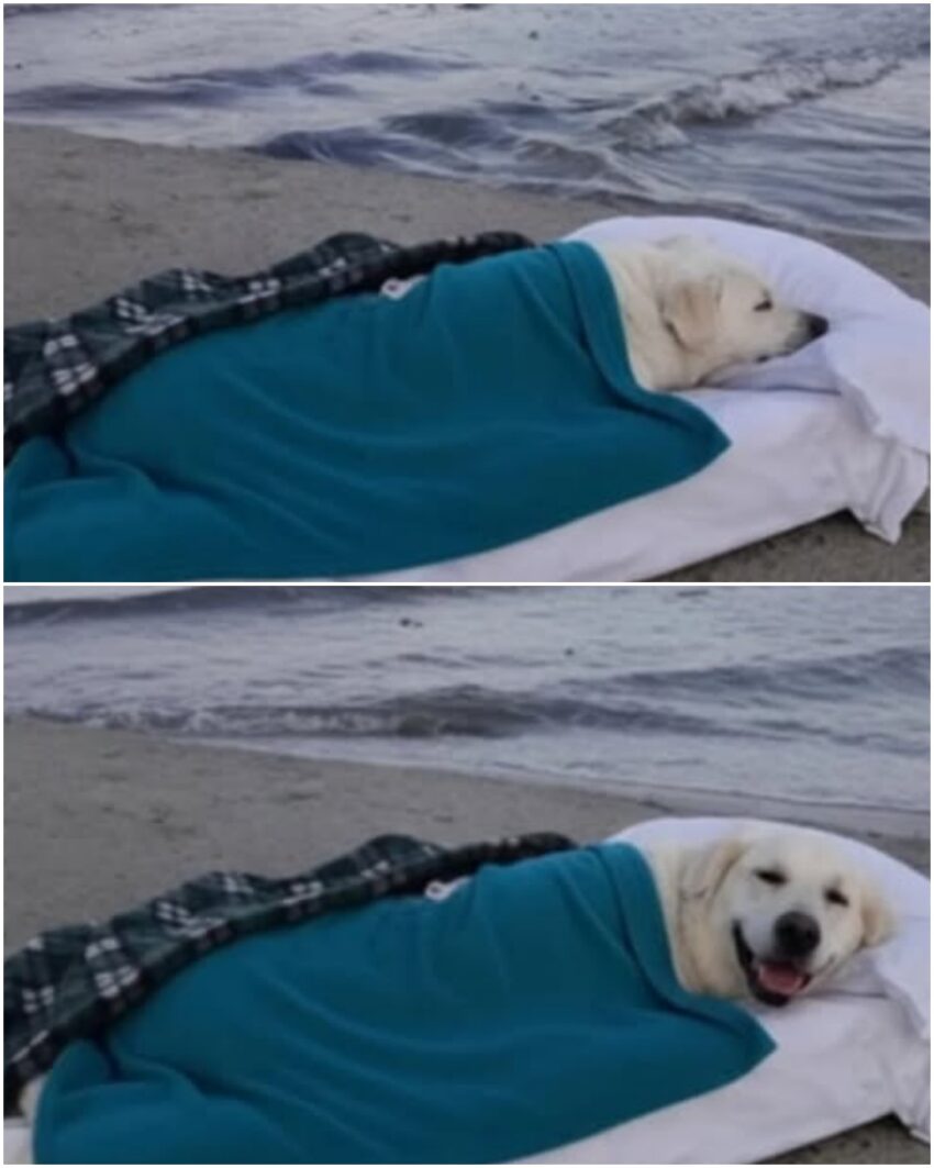 Sam spread their old blanket on the sand. It was frayed and faded, worn thin by years of shared moments, but it was perfect. Buddy lay down slowly, resting his head where Sam’s legs formed a shelter. The wind moved gently around them, as if careful not to disturb the moment.
