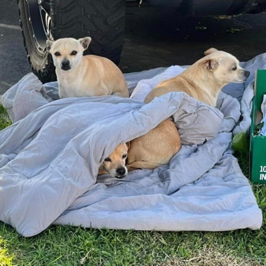 Beneath it, three pairs of fearful eyes peeked out. The dogs had hidden themselves away, clinging to warmth, safety, and each other.