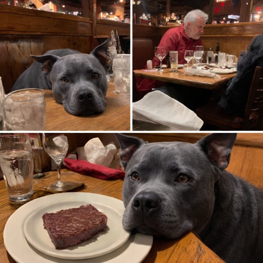 While glasses clinked and conversations buzzed, he rested his head gently on the table, eyes steady, manners flawless. No barking. No begging. No [ch.a.os]. Just gratitude in its purest form—waiting patiently as a modest steak was placed in front of him. A well-earned bite, on Veterans Day, for a veteran who happens to have four legs and a pit bull smile.