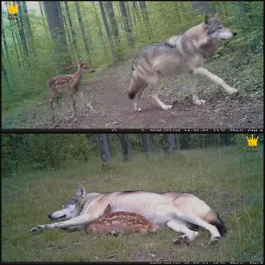In another clip, the fawn is curled up against the wolf, sleeping. The wolf stays alert, standing watch like a guard. Specialists who saw the footage said it’s rare, but not impossible, for animals to form strange bonds when one is alone and the other is lost.