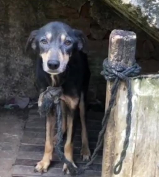 His frail body and patchy fur were evidence of severe neglect, and the dark corner where he lived mirrored the emotional pain he suffered. Having lost trust in humans after years of mistreatment, the dog was initially cautious around us.