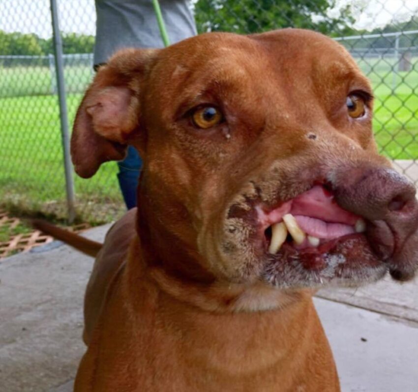 This mixed-breed canine, picked up by animal control in Huntsville, Texas, had a unique look caused by a deformity that resulted in half of his nose and part of his lips being missing.