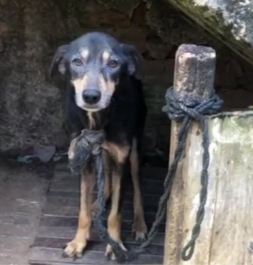His frail body and patchy fur were evidence of severe neglect, and the dark corner where he lived mirrored the emotional pain he suffered. Having lost trust in humans after years of mistreatment, the dog was initially cautious around us.